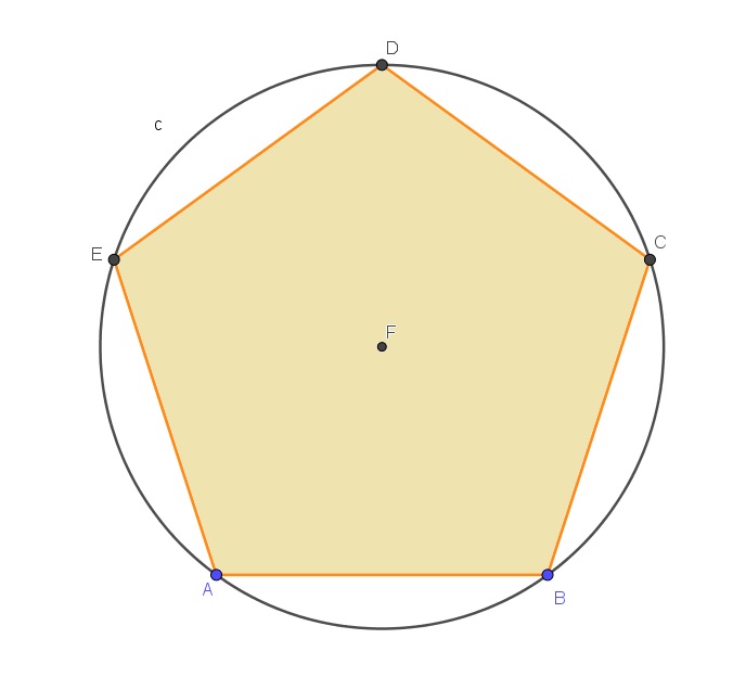 La medida de cada ángulo del centro es de 72$^{\circ}$, ya que la suma de los 5 ángulos debe ser 360$^{\circ}$. Al rotar el pentágono en 2$\cdot$ 72$^{\circ}$ = 144$^{\circ}$ en sentido antihorario en torno a F, el vértice A quedará en la posición donde se encontraba el vértice C inicialmente.