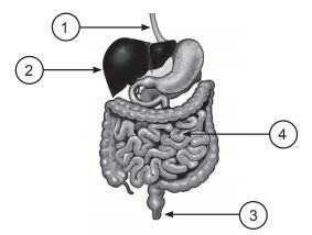 En el siguiente esquema que representa parte del sistema digestivo, se indican algunos órganos y cuatro estructuras numeradas.