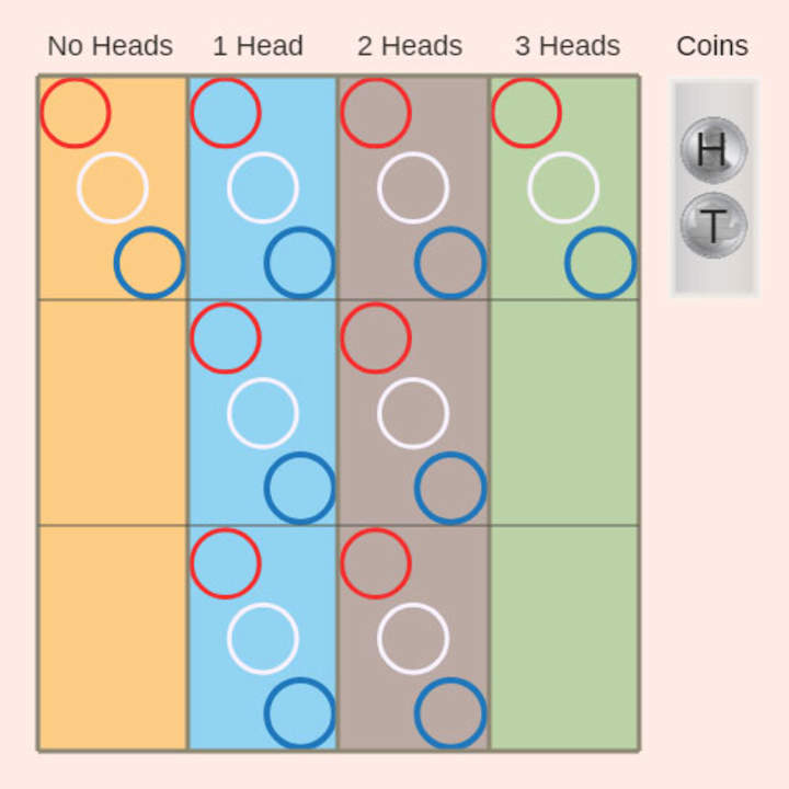 Pedro lanza 3 monedas justas y quiere calcular las probabilidades de los diferentes resultados de estos 3 lanzamientos de monedas. Para calcular las probabilidades, Pedro hizo una tabla para ordenar todos los resultados posibles. Aunque dos juegos diferentes de monedas de $ $ 3 @ $ pueden tener el mismo número de caras y colas, el orden en que se voltearon puede ser diferente. Pedro decide usar círculos de colores y voltea @ $ 3 @ $ monedas. El primer giro irá en un círculo rojo, el segundo en blanco y el tercero en azul. El número de caras y colas que obtiene determina en qué columna van las tres monedas. Ayuda a Pedro a encontrar todas las permutaciones posibles. Arrastre las monedas de la caja a los círculos para ilustrar las diferentes formas de obtener cada número de caras de los 3 lanzamientos de monedas.