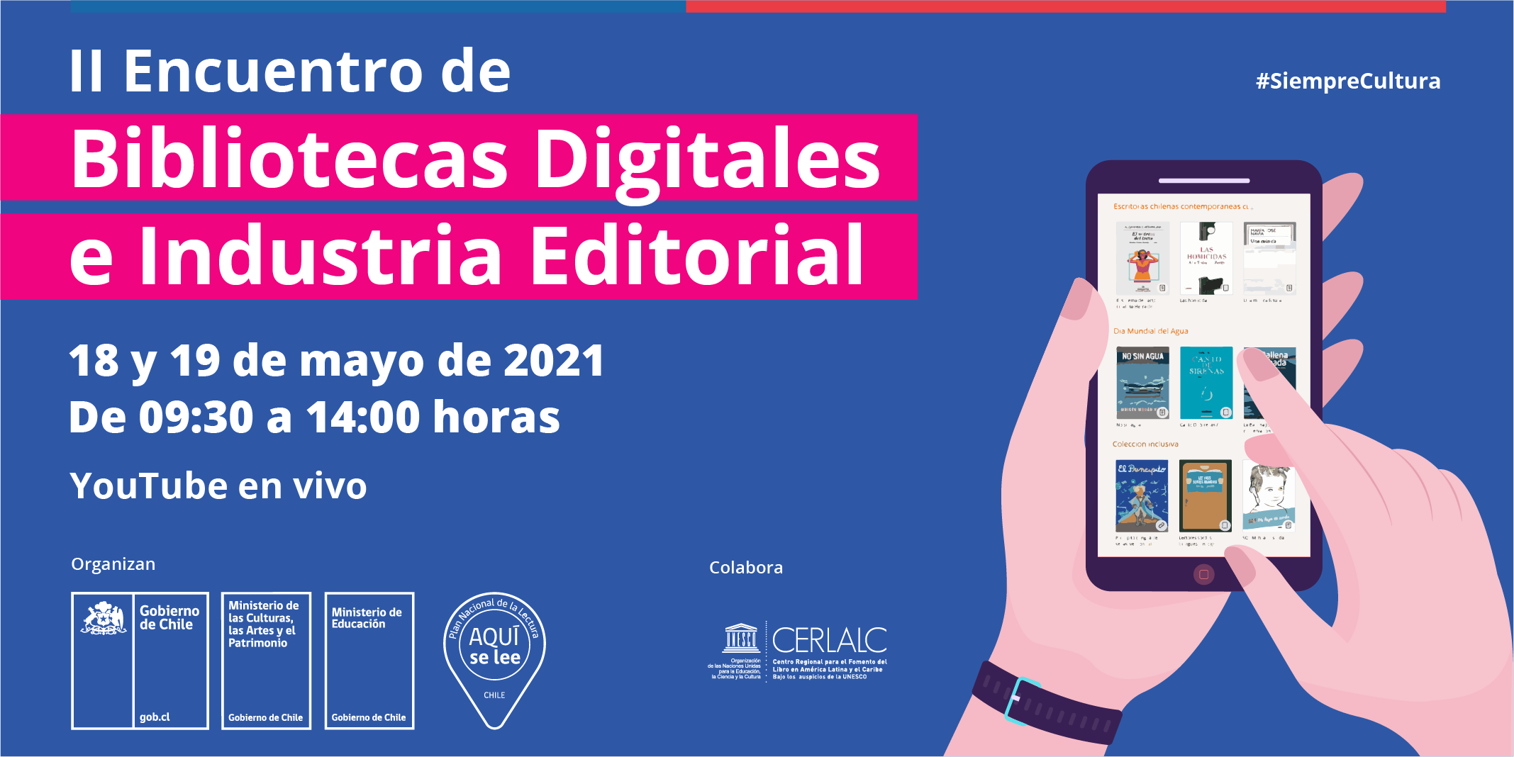El Ministerio de las Culturas, las Artes y el Patrimonio y el Ministerio de Educación, en el marco de la Política Nacional de la Lectura y el Libro, organiza el II Encuentro de Bibliotecas Públicas Digitales e Industria Editorial, que se realizará el próximo martes 18 y miércoles 19 de mayo entre las 9:30 y las 14:00 horas.