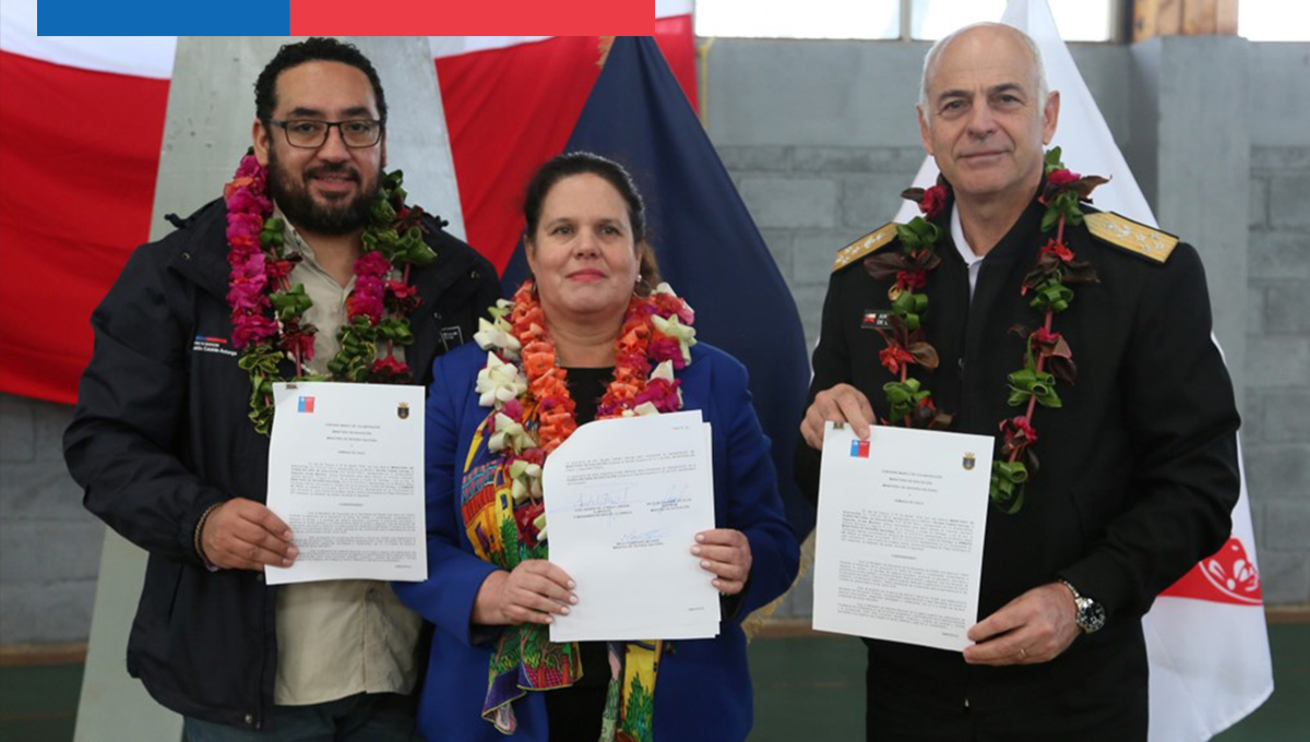 Rapa Nui. En el Liceo Aldea Educativa Hoŋa'a o te Mana, en Rapa Nui, el ministro de Educación, Nicolás Cataldo, la ministra de Defensa Nacional, Maya Fernández, y el Comandante en Jefe de la Armada, el almirante Juan Andrés de la Maza, firmaron un convenio de trabajo conjunto que busca promover conciencia y cercanía de las comunidades educativas al mar en establecimientos de todo el país.
