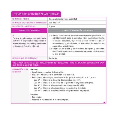 - 3.2 Elabora correctamente los documentos necesarios para iniciar una actividad laboral, como el curriculum vitae, reuniendo evidencias de cursos realizados, experiencia laboral previa y cartas de recomendación, y visualizando sus alternativas de acuerdo a sus expectativas y condiciones.