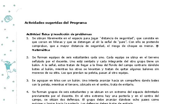 Ejecutar juegos colectivos y deportes, creando tácticas y estrategias y demostrando formas para resolver un problema en relación con el espacio, el objeto y los adversarios; por ejemplo: dar tres pases en cinco segundos o dar tres pasos y dar un pase a un compañero.