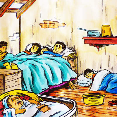 Ilustración que representa las malas condiciones de las viviendas durante la revolución industrial (color)