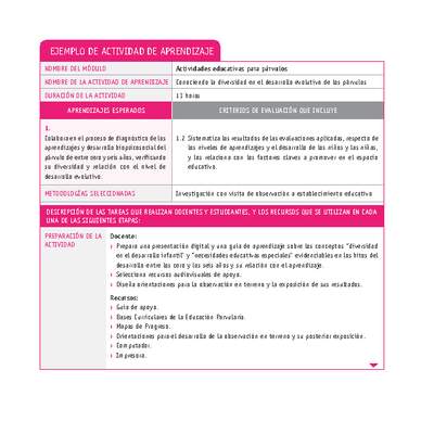 - 3.4 Propone a la educadora o el educador ideas para formular indicadores de evaluación que consideren el nivel de desarrollo de los niños y las niñas, generando alternativas que atiendan la diversidad de necesidades de los párvulos.
