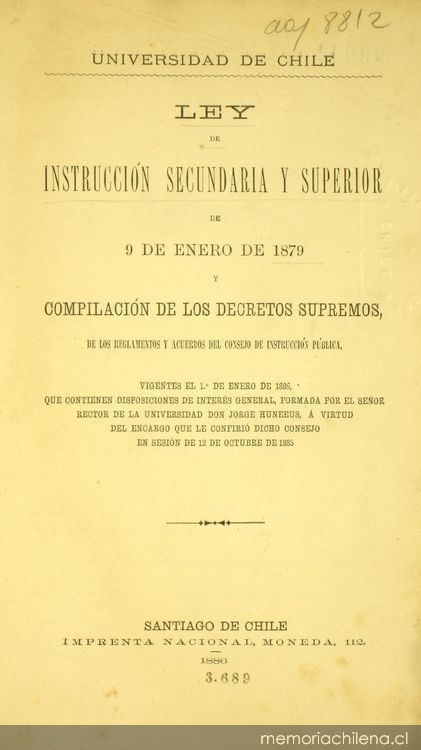 Ley de instrucción secundaria y superior: de 9 de enero de 1879 y compilación de los decretos supremos, de los reglamentos y acuerdos del Consejo de Instrucción Pública, vigentes el 1o. de enero de 1886, que contienen disposiciones de interés general, formada por el señor rector de la universidad Don Jorge Huneeus, á virtud del encargo que le confirió dicho Consejo en sesión de 12 de octubre de 1885