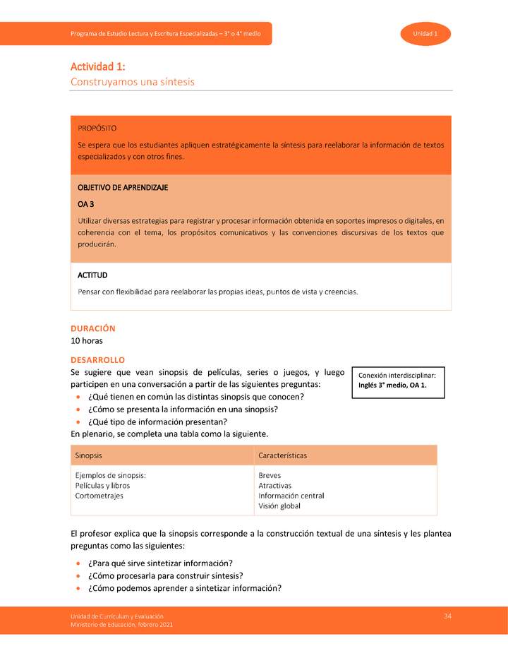 El propósito de la actividad es que los estudiantes apliquen estratégicamente la síntesis para reelaborar la información de textos especializados y con otros fines.