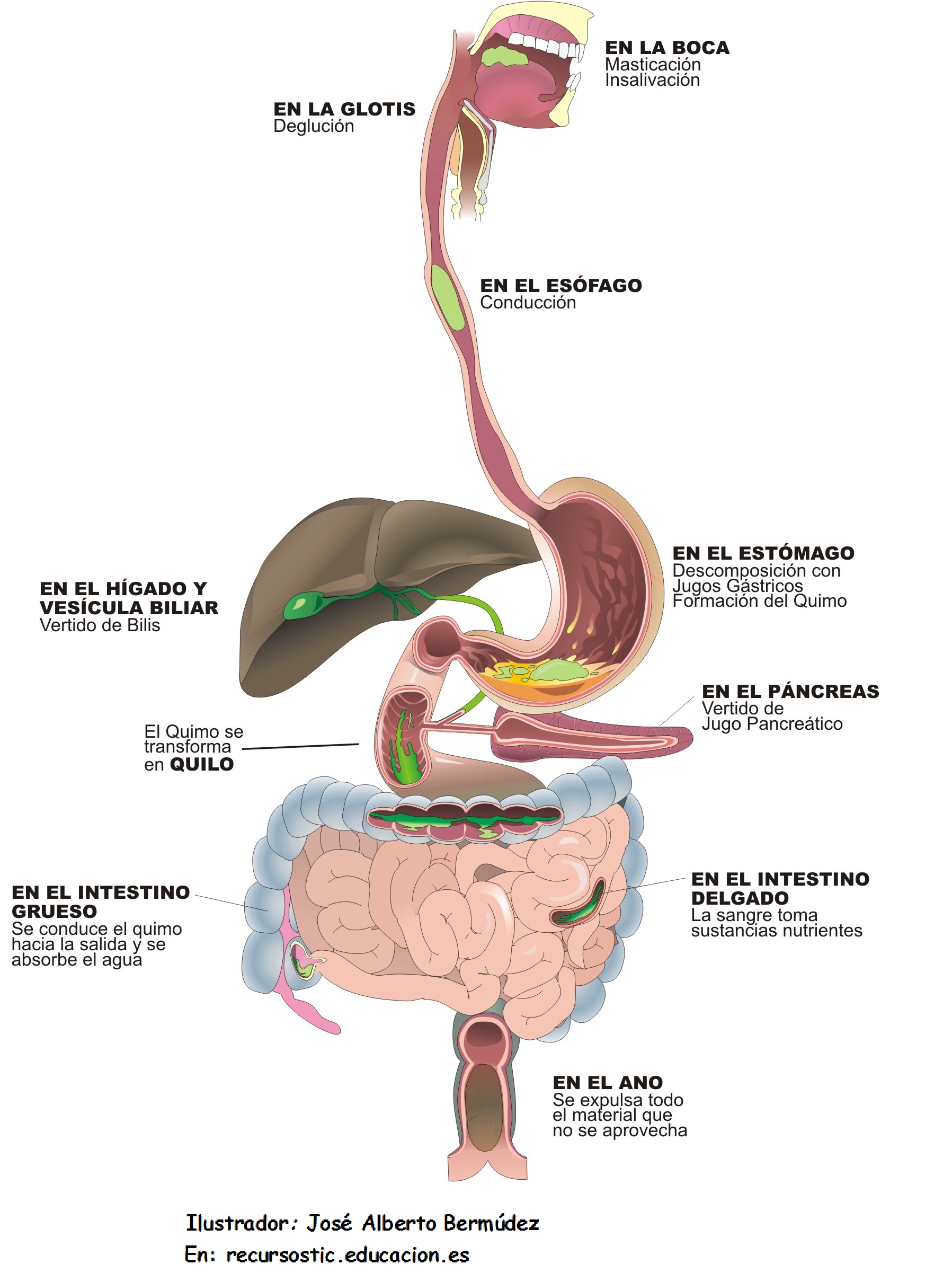 Identificar y describir por medio de modelos las estructuras básicas del sistema digestivo (boca, esófago, estómago, hígado, intestino delgado, intestino grueso, recto y ano) y sus funciones en la digestión, la absorción de alimentos y la eliminación de desechos.